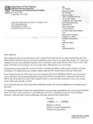 Advocates for the Holy Family 501(c)3Certification